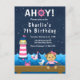 Este convite fofo e divertido apresenta uma macaca marinheira náutica em um deque de madeira com uma gaivota e um caranguejo. Ao fundo, há um farol rosa e branco, um pássaro fofo em um veleiro, ondas do mar e um céu noturno estrelado azul-marinho. O texto combina fontes negrito e serifadas para um visual elegante e moderno. Isso é perfeito para uma festa de aniversário com tema náutico.