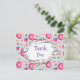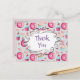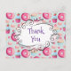 Um obrigado personalizado que você faz cartão postal para seus convidados festas de aniversário. Personalize com seu nome no verso. A frente tem um padrão de rosquinhas cor-de-rosa vidradas com aspersores. Cupcakes de abeberamento da boca, cor-de-rosa e azul, com rosetas e morangos em cima. Algumas macarrões pastel cor-de-rosa e alguns botões cor-de-rosa. Um quadro branco de rico no centro diz "Obrigado" em uma fonte fofa. As costas têm uma mensagem de aniversário preparada, tudo o que tens de fazer é adicionar o teu nome.