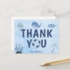 Convites de agradecimento de chá de bebê de praia fofa. Cartão de agradecimento temático de animais marinhos em aquarela azul linda com um salva-vidas náutico como o O em VOCÊ. Animais costeiros fofos rodeiam sua mensagem personalizada, incluindo uma baleia e um peixe debaixo do mar.