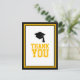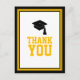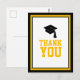 Diga obrigado com esta Festa de formatura negra e Dourada. Obrigado Cartão-postal. Apresenta 'Obrigado' em ouro e um boné de formando preto cercado por uma borda dourada e negra. O verso é vazio para a sua mensagem pessoal.