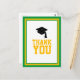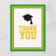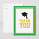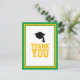 Agradeço-vos com esta Festa de formatura Verde e Dourada. Obrigado Cartão-Postal. Apresenta 'Obrigado' em ouro e um boné de formando preto cercado por uma borda verde e dourada. Você pode escrever sua mensagem pessoal no verso.