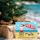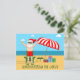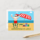 Este cartão postal de Natal em Julho fofo é um convite perfeito para uma festa de verão na praia ou reunião na piscina. Torne-o uma extravagância temática divertida do Polo Norte com o Papai Noel em seu calção de banho ao lado de um guarda-sol listrado de vermelho e branco e presentes. Nunca vi o Sr. Klaus de calção de banho antes! O texto verde une o tema divertido de Natal.