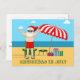Este cartão postal de Natal em Julho é um convite perfeito para uma festa de verão na praia ou reunião na piscina. Torne-o uma extravagância temática do pólo norte com o Papai Noel em seu calção de banho ao lado de um guarda-sol listrado de vermelho e branco e presentes. Nunca vi o Sr. Klaus de calção de banho antes! O texto verde une o tema divertido de Natal.