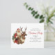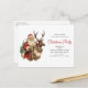 Convite postal com uma ilustração de Natal divertida. Papai Noel em seu terno vermelho tradicional cavalgando uma rena grande e picada decorada com o Holly. Uma árvore de Natal nas costas.