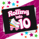 Este design de festa de patins é perfeito para uma festa de patins ou tema de aniversário para uma menina de 10 anos de idade. Se a aniversariante adora patinar, ela vai ADORAR este design de festa de patins! Recursos de estilo retrô 'Rolando para os 10' citação de aniversário com gráfico de patins legal com arco-íris e estrelas que é divertido e único. Design de festa de patins divertido para o 10º aniversário de uma menina!