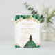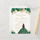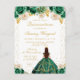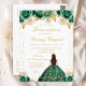 Este convite de aniversário de Quinceañera elegante e glamoroso apresenta uma bela princesa com cabelos escuros em uma tiara e um vestido de baile verde. O texto combina caligrafia manuscrita e fontes modernas sem serifa para um visual sofisticado e elegante. Os arranjos florais e confetes dourados criam a combinação perfeita de rústico e chique.