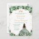 Este convite de aniversário de Quinceañera elegante e glamoroso apresenta uma bela princesa com cabelos escuros em um vestido de baile verde sálvia. O texto combina caligrafia manuscrita e fontes modernas sem serifa para um visual sofisticado e clássico. Os arranjos florais e confetes dourados criam a combinação perfeita de rústico e chique.