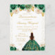 Este convite de aniversário de Quinceañera elegante e glamoroso apresenta uma bela princesa com cabelos escuros em uma tiara e vestido de baile verde. O texto combina caligrafia manuscrita e fontes modernas sem serifa para um visual sofisticado e elegante. Os arranjos florais e confetes dourados criam a combinação perfeita de rústico e chique.