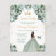 Este convite de aniversário de quinze anos elegante e glamoroso apresenta uma bela princesa de pele morena em um vestido de baile verde sage. O texto combina caligrafia manuscrita e fontes modernas sem serifa para um visual sofisticado e elegante. Os arranjos florais, borboleta e confetes dourados criam a combinação perfeita de rústico e chique.