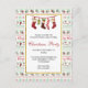 Um convite de festas de Natal com um padrão repetitivo no fundo, num estilo feio de suéter de Natal. O padrão é composto por meias, bolas de natal, estrelas e flocos de neve. Com o texto de Feliz Natal em vermelho. Camadas sobre o topo é um retângulo branco com uma borda falsa de folha de ouro, dentro é uma ilustração de meias penduradas antiquadas. O texto personalizado do seu partido por baixo.