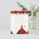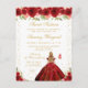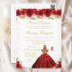 Este convite de aniversário de dezesseis anos elegante e glamoroso apresenta uma bela princesa com cabelos loiros e pele clara em um vestido de baile vermelho. O texto combina caligrafia manuscrita e fontes modernas sem serifa para um visual sofisticado e clássico. As composições florais, borboletas e confetes dourados criam a combinação perfeita de rústico e chique.