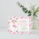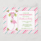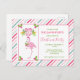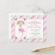 Um cartão postal de convite de festas de natal festivo. Um fundo listrado de canas cor-de-rosa e verde. Camada sobre o topo é um flamingo rosa rico com uma perna erguida para cima. Vestindo um chapéu de santa rosa e um pouco de holly sazonal. Holly com bagas também enfeita os cantos. Um buquê floral acima de sua cabeça com canas doces cruzadas.