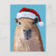 Uma ilustração encantadora de uma capybara vestindo um chapéu de Santa contra um fundo azul brilhante. A curiosa expressão e o traje de férias de capybara fazem desta uma perfeita imagem festiva, trazendo uma vibração divertida e alegre para a época de férias.