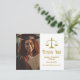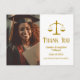 Elegante cartão postal de agradecimento de graduado em direito com a balança da justiça ao lado da sua foto de formatura. Personalize esses cartões postais de agradecimento de advogado com letra dourada elegante ao lado da sua fotografia de advogado.