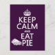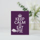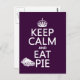 Aqui se lê Manter Calmo e Comer Pie, no estilo do clássico manter calma poster. Há uma silhueta de um delicioso torta de cheio ao lado das palavras. Este é um design excelente divertido para todos que amam torta, e o usa como medida de emergência. Presentes maravilhosos para padeiros, cozinheiros e amantes de tortas.
