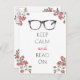 As rosas cor-de-rosa nos quatro coners ilustram este fundo branco com óculos de leitura adoráveis em padrão floral escuro. Sob ela está escrito Manter a calma Ler.