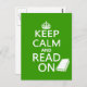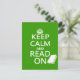 Este é o clássico poster de guerra "Manter Calmo e Continuar", reformulado para "Manter Calmo e Ler". Está escrito em branco sobre fundo colorido, e é acompanhado por uma silhueta de um livro para um lado.