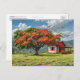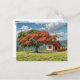 Experimente o charme do interior porto-riquenho com este cartão-postal com a água mostrando uma árvore flamboyán vibrante em flor de cheio. Colocada no cenário de uma tradicional casa de madeira e de uma paisagem montanhosa cênica, esta "estampa jíbara" captura a essência da vida rural porto-riquenha.