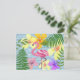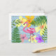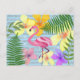 Linda, rosa flamingo em combinação com coloração aquosa, flores tropicais e palmeiras. Luau, adorável, padrão de listras azuis, cartão postal de verão.
