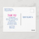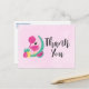 Um obrigado de festa você faz um cartão branco de um flamingo rosa quente com melancias e abacaxi. Sumério e tropical. O fundo é rosa claro. Mensagem personalizada no verso.