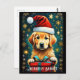 Este cartão de Natal apresenta um adorável cachorrinho retriever dourado em um chapéu de Papai Noel com um presente de Natal em um fundo de floco de neve dourado. Este cartão de Natal do retriever dourado será um favorito entre os amantes de retriever dourado, amantes de cães e amantes de animais.