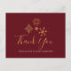 Cartão de agradecimento com uma ilustração de flocos de neve dourados sofisticados com formas cristalinas elegantes. Um fundo vermelho escuro. Mensagem personalizada no verso.
