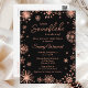 Este convite postal elegante e glamoroso apresenta flocos de neve em falso brilho rosa dourado aquarela e brilhos em um fundo preto. É perfeito para um chá de bebê com tema de inverno ou Natal.