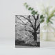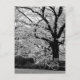 Uma fotografia em preto e branco de uma bicicleta estacionada em frente a uma grande árvore de cerejeira em flor numa rua em Tóquio, Japão.