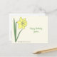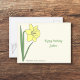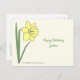 Um cartão postal amarelo claro de aniversário com uma ilustração botânica da flor daffodil em cores pastel (Narciso pseudonarciso) e textos personalizáveis (topo e baixo): perfeito para acompanhar um presente ou para enviar ao seu melhor amigo. No verso há um daffodil selvagem na arte da linha! O Daffodil é a flor de nascimento de março, a flor de Peixes e Aries e é um significado simbólico de renascimento, perdão, criatividade, energia e vitalidade.