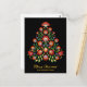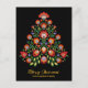 A frente do cartão-postal apresenta uma cena de feriado incrível. Contra um fundo preto profundo e veludo, uma majestosa árvore de Natal ganha palco central. A árvore não é composta por ramos tradicionais eververdes, mas preferencialmente uma vibrante variedade de flores meticulosamente trabalhadas inspiradas no folclore. Essas flores, em tons de vermelho rico, amarelo escuro, lavanda delicada, pêssego mole e azul ardósia, se entrelaçam perfeitamente para formar a forma da árvore. O estilo recortado das flores dá um toque caprichoso, criando um efeito visual encantador. O detalhamento intrincado de cada pétala e folha adiciona profundidade e textura, enquanto as folhas verdes da floresta dão contraste natural às flores vivas. No geral, este cartão-postal encapsula a magia do Natal através de uma fusão única de flores inspiradas no folclore e de imagens tradicionais de férias. Promete evocar sentimentos de calor, nostalgia e maravilha no receptor.