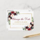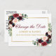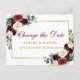 Moderno Elegante Watercolor Burgundy Marsala Floral Mudança Floral A Data do Cartaz de Adiamento de Casamento apresenta rosas arrojados, rosas cor-de-rosa, flores azuis, verde e um quadro de ouro