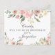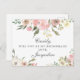Um elegante buquê floral de peônias cor-de-rosa e rosas de marfim enquadra o topo deste maravilhoso cartão postal de verão que diz Will You Be My Bridesmaid. As manchas de sábio saem decoradas no meio do conjunto de flores de pêssego que rodeiam a bela escrita cursiva. Um belo convite personalizado para uma festa noiva.