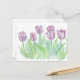 Um cartão postal bonito com lavanda e tulipas mauve pintadas em aquarela. Lindas flores de primavera!