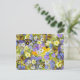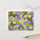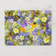Um cartão postal floral bonito, colorido, com uma bela imagem das flores de primavera de todos os tipos, incluindo margaridas amarelas, margaridas brancas e flores azuis, brancas e roxas.