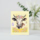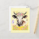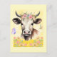 Belo cartão postal de vaca com flores, borboleta e libélula, sobre fundo amarelo-borboleta. Adorável para alguém que ama vacas.