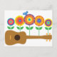 Uma imagem horizontal de um ukulele marrom, com flores estilizados e um pássaro azul que salta acima do ukulele.