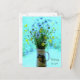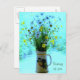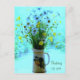 Cartão postal de flores silvestres pensando em você. O cartão de fotografia floral tem Margaridas e Botões-de-ouro em um velho jarro de vidro fotografado e com uma tonalidade azul. O texto da frente diz "Pensando em você" e o verso diz "e enviando uma oração". Ambas as áreas estão em formato de modelo para fácil personalização. Adequado como uma saudação de melhoras ou encorajamento.