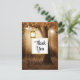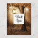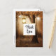 Obrigado cartão postal com uma ilustração quimicamente encantadora em cores ricas marrom e amarela. Uma floresta mística mágica com uma grande árvore segurando uma lanterna antiquada. Luzes de fada dançando ao redor. Uma design maravilhosa e encantadora.