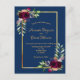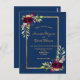 Na frente: um fundo azul marinho com uma estrutura falsa em ouro. Decorados com flores escuras e burgosas, rosas, penas e verde ao estilo do bô. Modelos para seus nomes e detalhes do casamento. Os nomes são escritos com um script de estilo manuscrito, letras ouros coloridas. Fundo: fundo azul marinho e algumas flores.
