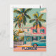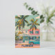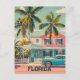 Uma ilustração nostálgica e inspirada no vintage de uma encantadora casa pastel colorida aninhada entre palmeiras altas em Key West, Flórida. A casa tem um amplo alpendre com corrimões brancos e uma porta da frente acolhedora. O céu é azul claro e ensolarado, com nuvens brancas fofas. A atmosfera geral é pacífica e relaxante, evocando um senso de charme retrô.