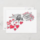 Mantida pelos corações de amor com padrão vermelho-rosa, ela sorri sabiamente. Em vermelho-pinto e preto, contra um fundo branco.