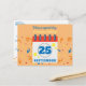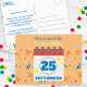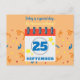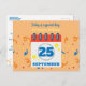 Celebre um dia especial com nosso vibrante e personalizável cartão postal de aniversário! Este design ostenta um estilo gráfico lúdico e comemorativo, perfeito para marcar marcos memoráveis. No centro do cartão postal está uma encantadora ilustração de um calendário, com uma data específica circulada para homenagear o grande dia da pessoa que faz aniversário. O número '25' é exibido de forma proeminente dentro de um círculo, simbolizando a data, enquanto o mês 'SETEMBRO' é escrito em letras maiúsculas e negrito abaixo.