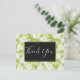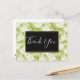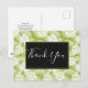 Um cartão postal de agradecimento com um padrão repetitivo de grandes folhas de palmeira em um fundo verde-oliva. Mensagem personalizada no verso.