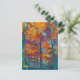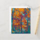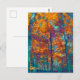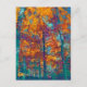 Uma imagem pintada de árvores durante o outono, em cores ousadas de amarelo, roxo, laranja e chalé.
