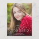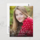 Este cartão-postal de formatura minimalista apresenta tipografia moderna e uma grande foto. Na frente, "Graduado" é escrito em letras prateadas únicas com um grande floreio. O ano de formatura é colocado dentro do floreio, e o nome do graduado e a escola estão abaixo. O design da tipografia sobrepõe uma grande foto vertical. No verso do cartão-postal de formatura, você pode adicionar uma mensagem aos destinatários e/ou informações sobre a festa de formatura.