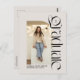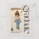 Moderno e elegante, este cartão postal de anúncio de formatura e convite para festa de formatura com duas fotos é perfeito para o formando ousado e moderno. Com uma foto arqueada única na frente com tipo moderno e ousado, este design também tem espaço no verso para uma segunda foto e texto de convite para festa de formatura. O texto no verso também pode ser usado para uma mensagem de agradecimento, planos futuros e muito mais. Este anúncio de formatura e convite para festa de formatura combinado é perfeito para formandos do ensino médio ou faculdade e funciona bem para homens ou mulheres. A foto da frente é vertical em um fundo branco-desligado e a parte de trás é horizontal. Encontre peças coordenadas e mais cores na coleção de Lea Delaveris Design.