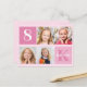 Convite de aniversário quadrado para 4 fotos para uma menina. Celebre o aniversário do seu filho com 4 fotografias adoráveis deles neste cartão postal com quadrados rosa bonito e adicione sua própria fotografia. Adicione o nome e a idade deles.