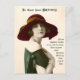 Cartão de felicitações de aniversário antigo. Jovem mulher com chapéu e vestido da moda antiga. "Para Saudação do seu aniversário" no topo em fonte tipográfica vitoriana. "Todos os mais doces desejos que posso lembrar; Aqui para saudar seu aniversário Com meu amor, você vai encontrar"