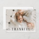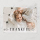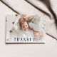 Celebre a gratidão com estilo com este moderno cartão de foto de Ação de Graças, apresentando uma grande foto personalizada da família e a palavra elegante AGRADECIDO ao longo do design. Perfeito para enviar saudações de feriado, compartilhar seu momento favorito em família ou expressar agradecimentos sinceros aos entes queridos. Este cartão personalizável permite que você adicione o nome da sua família, ano e mensagem para um toque verdadeiramente pessoal. Uma maneira calorosa e atemporal de espalhar alegria e gratidão nesta época.