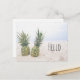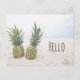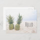 Um cartão postal com uma fotografia com um par de abacaxi sentado numa praia arenosa.